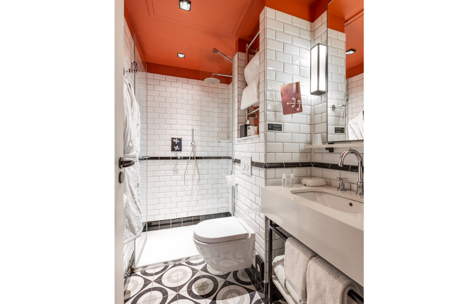 Le style d'Adèle & Jules twiste subtilement les classiques. Des accords heureux de céladon, framboise, pourpre et turquoise donnent le ton, tandis que moulures, motifs ikat et bayadères sont au diapason. Quelle que soit la taille de la chambre choisie, l'allure est souriante ; l'élégance, une fine évidence. Et bien sûr, il n'y a pas que le silence qui est ici moelleux : la literie a été expressément choisie pour un repos véritablement délassant. Quant aux salles de bains, l'esprit néo-rétro des carreaux de faïence Guimard comme les produits d'accueil Atelier Cologne indiquent qu'ici, on est bel… et bien à Paris.